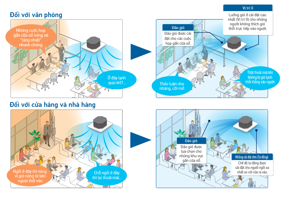 – Với chế độ hướng gió “Tự động”, các miệng gió được điều khiển mang lại luồng gió tối ưu khi phòng không có người.
