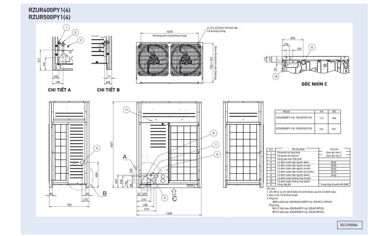 Khi nhiệt độ không khí ngoài trời vượt quá 35 độ hoặc phụ tải vượt quá khả năng tối đa do tải nhiệt toàn bộ dàn nóng sinh ra nhiều thì lấy không gian bên hút rộng hơn không gian thể hiện trong bản vẽ này.