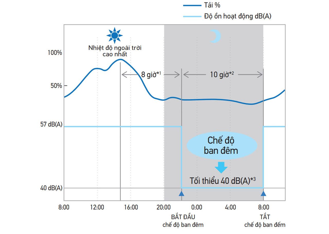 Chức năng vận hành êm ái vào ban đêm tự động triệt tiêu độ ồn hoạt động vào ban đêm bằng cách giảm công suất hoạt động để duy trì môi trường yên tĩnh của khu vực lân cận. Ba chế độ có thể lựa chọn có sẵn, tùy thuộc vào mức độ yêu cầu.