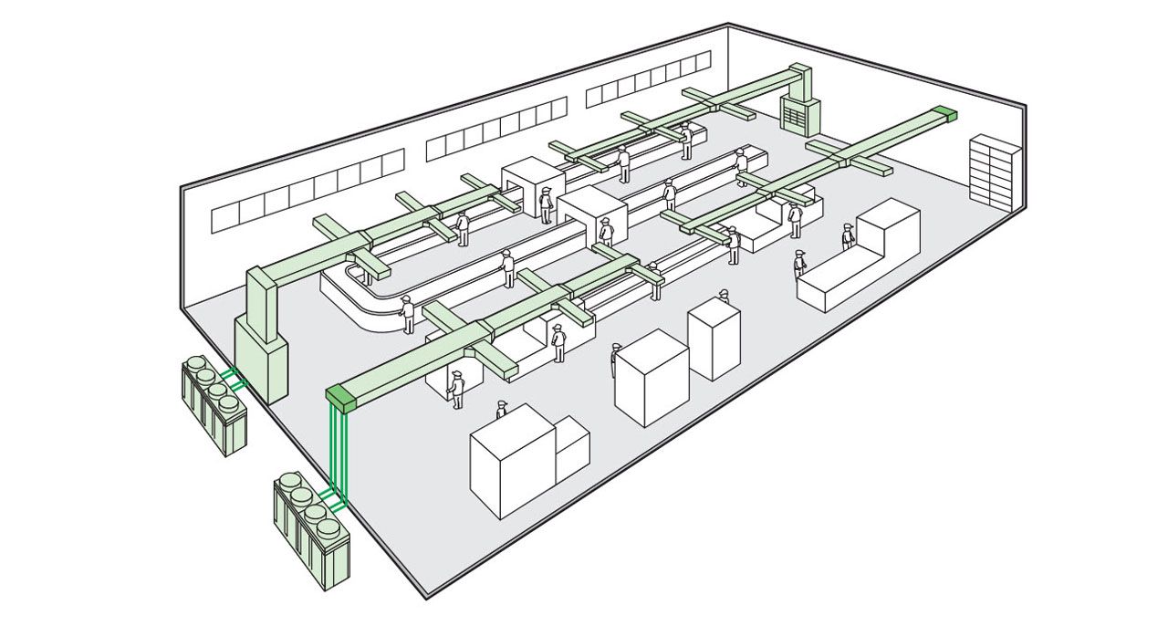 – Điều hòa không khí cho nhà xưởng bằng cách dẫn các đường ống gió trên cao.